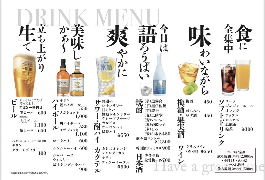 | 飲み放題(コース料理に限る) | ・飲み放題 ※平日(月・火・木)は¥1500円(100分) |